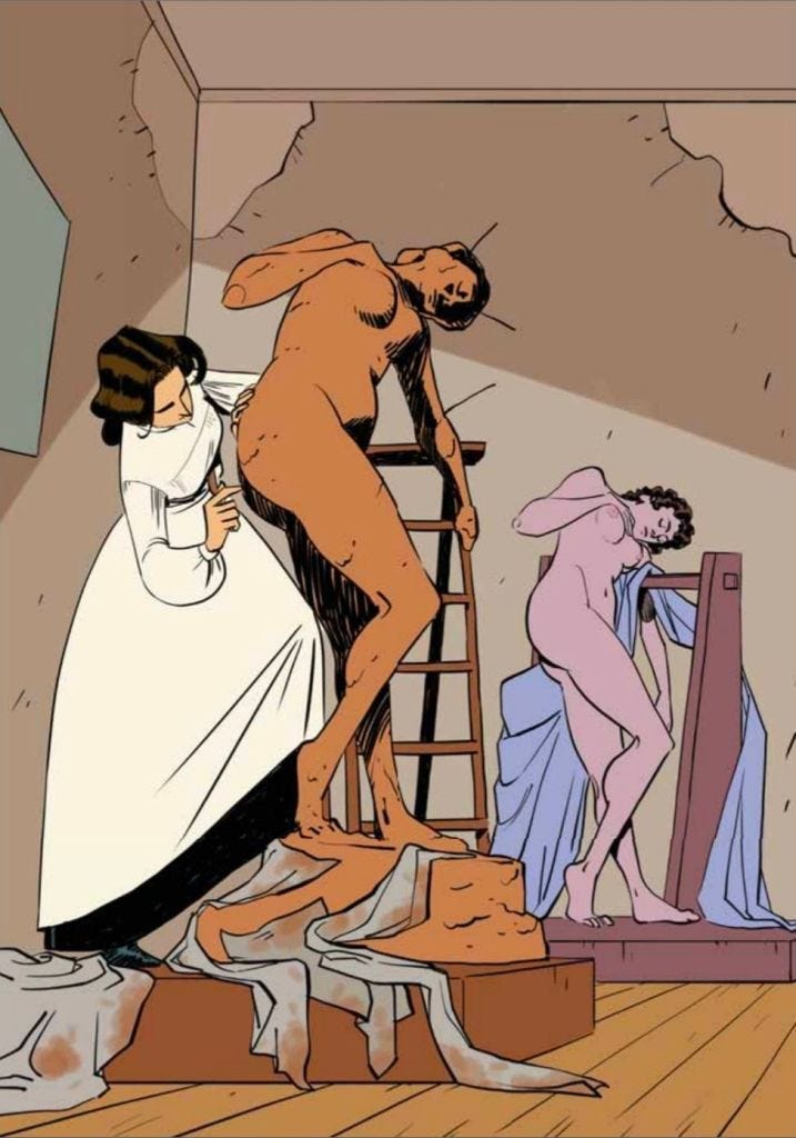 Sergio: È una domanda non facilissima perché solo il lavoro di disegno effettivo è durato per me un anno e mezzo. Ci sono moltissime sequenze che mi è piaciuto realizzare. Per me che disegno le scene oniriche sono state le più divertenti perché con l’onirismo puoi dare spazio libero alla fantasia. Mi è piaciuto tantissimo rappresentare tutte le scene di scultura. Difficile, ma allo stesso tempo mi ha ricordato quando ho studiato arte: ho cercato di ricordare anche la sensazione che si prova quando ti nasce qualcosa davanti agli occhi. E poi l’ultima sequenza è stata bella ma anche difficile. Difficile perché lavorare alla tavola della morte di Camille è stato struggente. Bello perché ha rappresentato pure per me una sorta di accompagnamento verso la fine.